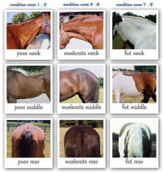 Tel de score van bovenstaande 6 punten op en deel dit door 6, dan heb je de juiste BCS. 1-3 is de categorie ‘te mager’, 4-6 is de categorie ‘goed’ en 7-9 is de categorie ‘overgewicht’, waarbij 5 ‘perfect ‘ is. Omdat het per paard dus verschilt waar hij vet opslaat of juist verliest kan het bijvoorbeeld zijn dat de billen in de categorie overgewicht vallen, maar de ribben en de nek in de categorie goed. Belangrijk is daarom ook het gehele plaatje te bekijken en aan de hand daarvan het rantsoen aan te passen waar nodig. In de afbeelding hiernaast / hieronder kun je goed zien en vergelijken waar jouw paard het meest op lijkt.