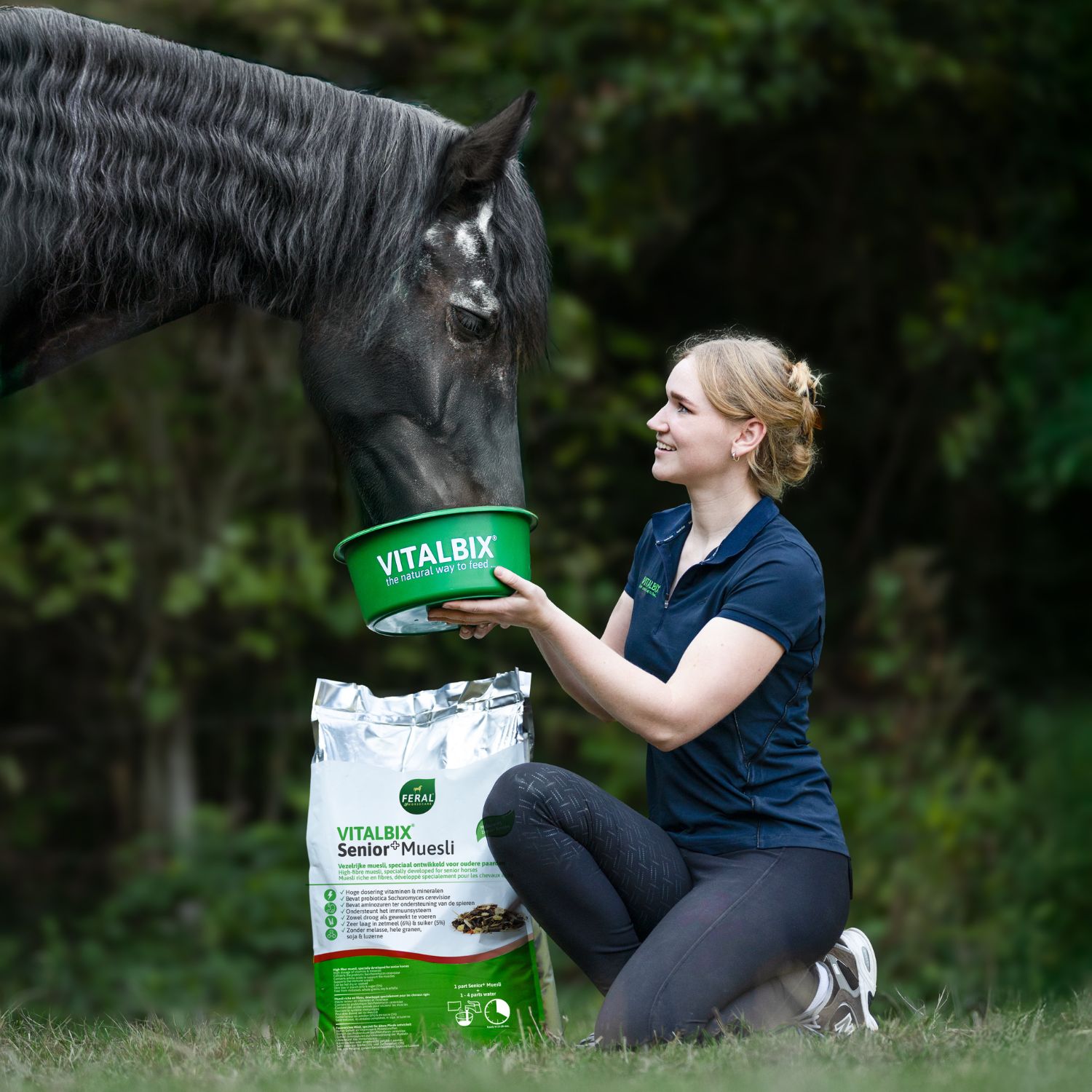Vitalbix Senior+ Muesli is een gezonde en vezelrijke muesli die speciaal is samengesteld voor het oudere paard. Dankzij het hoge vezel- en vetgehalte en het lage zetmeel- (6,0%) en suikergehalte (5,0%) ondersteunt Senior+ een gezonde maag- en darmflora en helpt het jouw oudere paard in goede conditie te blijven. Vitalbix Senior+ Muesli bevat een hoog aandeel goed opneembare vitaminen, mineralen en aminozuren. En de toegevoegde levende gisten (Saccharomyces cerevisiae) zorgen voor een optimale darmgezondheid en verbeteren de efficiëntie van de vezelvertering, waardoor jouw paard de voedingsstoffen nog beter kan opnemen. Het product bevat geen melasse, soja, luzerne of hele granen.
