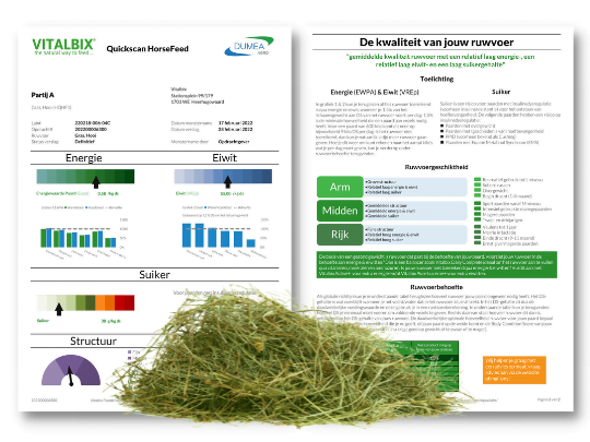 De Vitalbix Ruwvoer Quickscan geeft jou precieze en duidelijke antwoorden. Het Analyserapport toont energie & eiwit, suiker, structuur, lignine en droge stof. Ook wordt er duidelijk uitgelegd wat dat nou betekent.