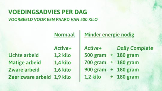 Simpel gezegd voer je van de Active+ dus ongeveer 4x zoveel als van de Daily Complete. Zo kom je namelijk in beide gevallen aan 100% vitaminen en mineralen. Voer je 1,2 kg Active+, dan zou je voor hetzelfde paard 300 gram Daily Complete voeren als ie totaal geen extra energie nodig had.